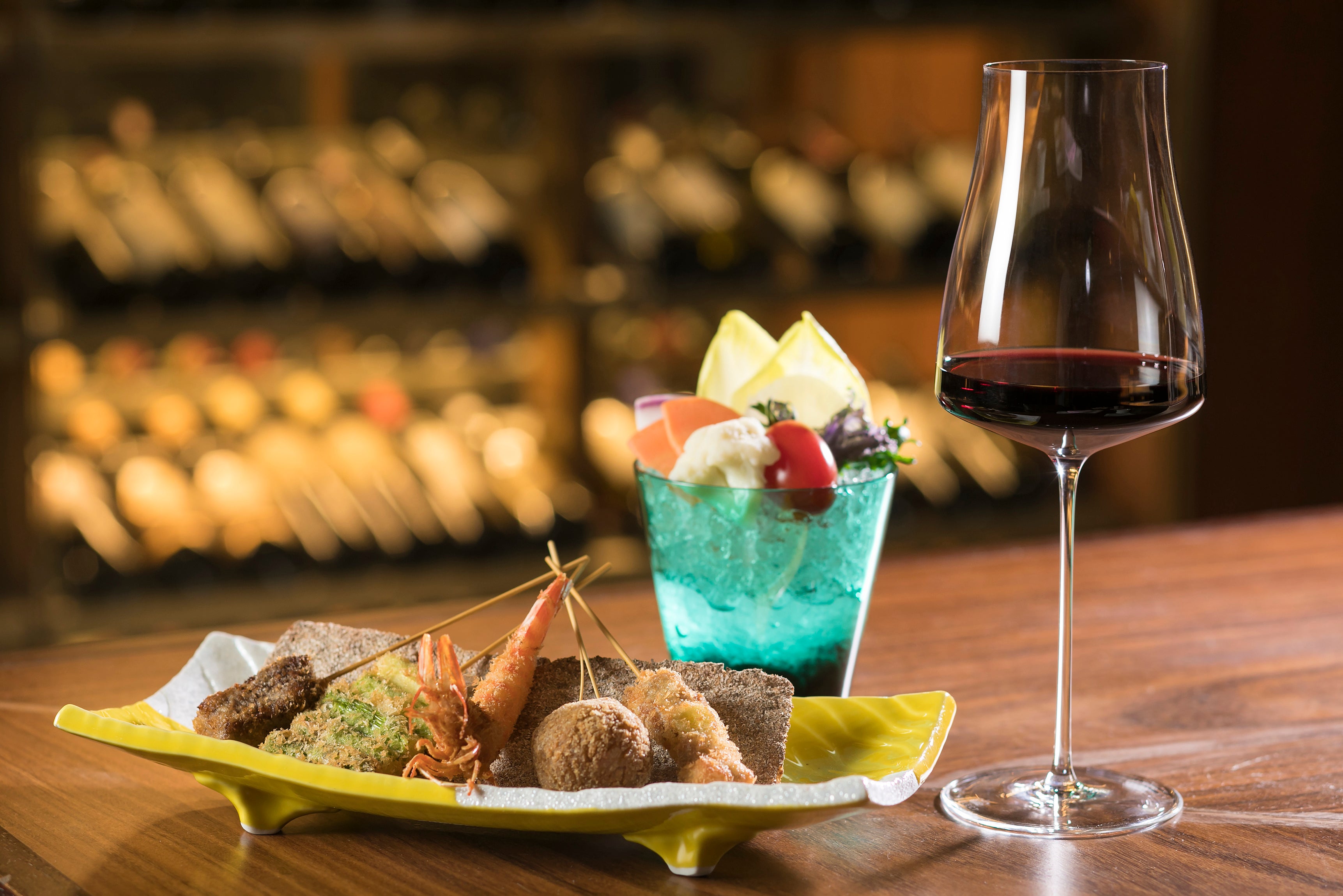新鮮な魚介類や旬の野菜を薄めの衣でからりと揚げた、ホテル風にアレンジされた創作串揚げ。新鮮で質の高い食材と、こだわりの油でサクッと揚げた空気のように軽やかな衣は、選び抜かれたワインとの相性は格別です。