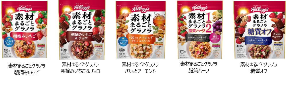 日本ケロッグ60周年の集大成製品として新発売する「ケロッグ素材まるごとグラノラ」は、これまで培ってきた知見や開発技術を活かし、素材一つ一つの良さを最大限に活かしたグラノラです。「“おいしさ”まるごと」「“栄養”まるごと」「“自然”まるごと」の3つの「まるごと」をコンセプトに、素材そのものの味や食感を楽しめるように改良を重ね作り上げました。
