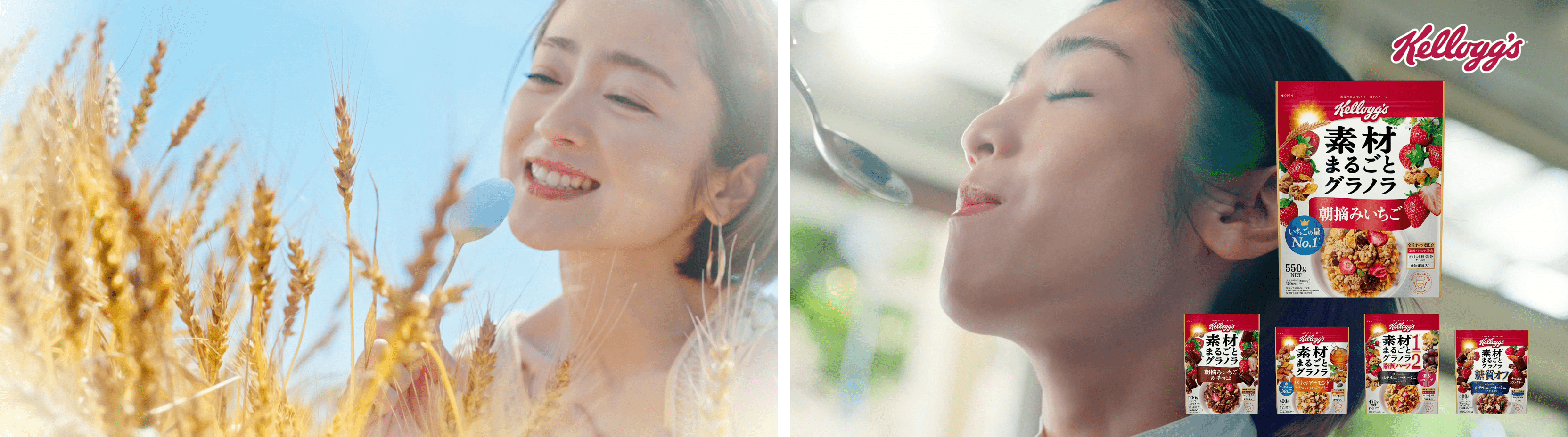 今年2022年に日本ケロッグは設立60周年を迎えました。「ケロッグ素材まるごとグラノラ」は、ケロッグが穀物の専門家として、長年に渡り培ってきた知見と開発技術を詰め込み、こだわり抜いて作り上げた60年の集大成のグラノラ製品です。CMキャラクターには、国民的女優であり、老若男女問わず幅広い年齢層に愛される安達祐実さんを起用し、安達祐実さん自身初となる“歌唱演技”に挑戦。CMでは、「ケロッグ素材まるごとグラノラ」を口にした感動から、壮大な麦畑にワープし、表情豊かに全力で「素材まるごと」の特徴を歌い上げる、迫力満点のシーンに注目です。歌の中では、グラノラに含まれる穀物や果物などの素材の力を、「まるごと」実感いただけることを表現しています。素材そのままの美味しさや食感を楽しむ安達さんの新CMをぜひご覧ください。