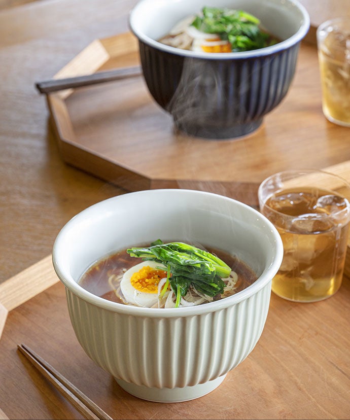 「茅乃舎ノ道具」は、伝統を日々の暮らしに取り入れ、その価値を伝えていくことを目的として展開しています。このたび、茅乃舎の思いや姿勢に共感頂き、素材や質感、使いやすさに徹底的にこだわった丼を特別に深川製磁様に作っていただきました。