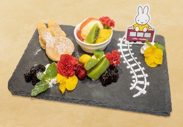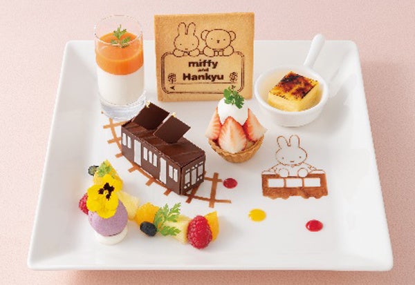 チョコケーキで作った阪急電車ケーキやにんじんとオレンジのソースで味わうレアチーズムースに、ミッフィーとボリスのクッキーを添えています。
