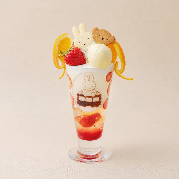 ミッフィーとボリスのクッキーがトッピングされたパフェ。ラズベリージャムとレモンゼリー、苺の層の上に、相性抜群のスポンジと苺ムースを重ねました。