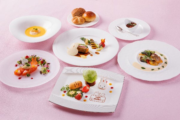 かわいいイラストが映える前菜や、ミッフィーの野菜を添えた魚料理、ミッフィーのクッキーを飾ったデザートなど全5品のコースです。