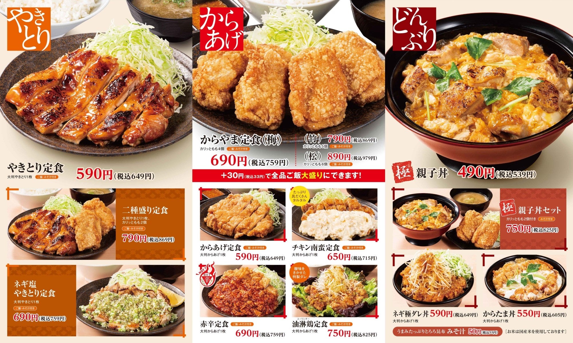 2022年3月、からあげ以外の鶏料理をもっと身近に手軽に楽しんでいただきたいと考え、⽇本⼈に愛されている「からあげ」だけでなく「親子丼」や大判の「やきとり」メニューなどが仲間入りした、新グランドメニューを販売開始いたしました。