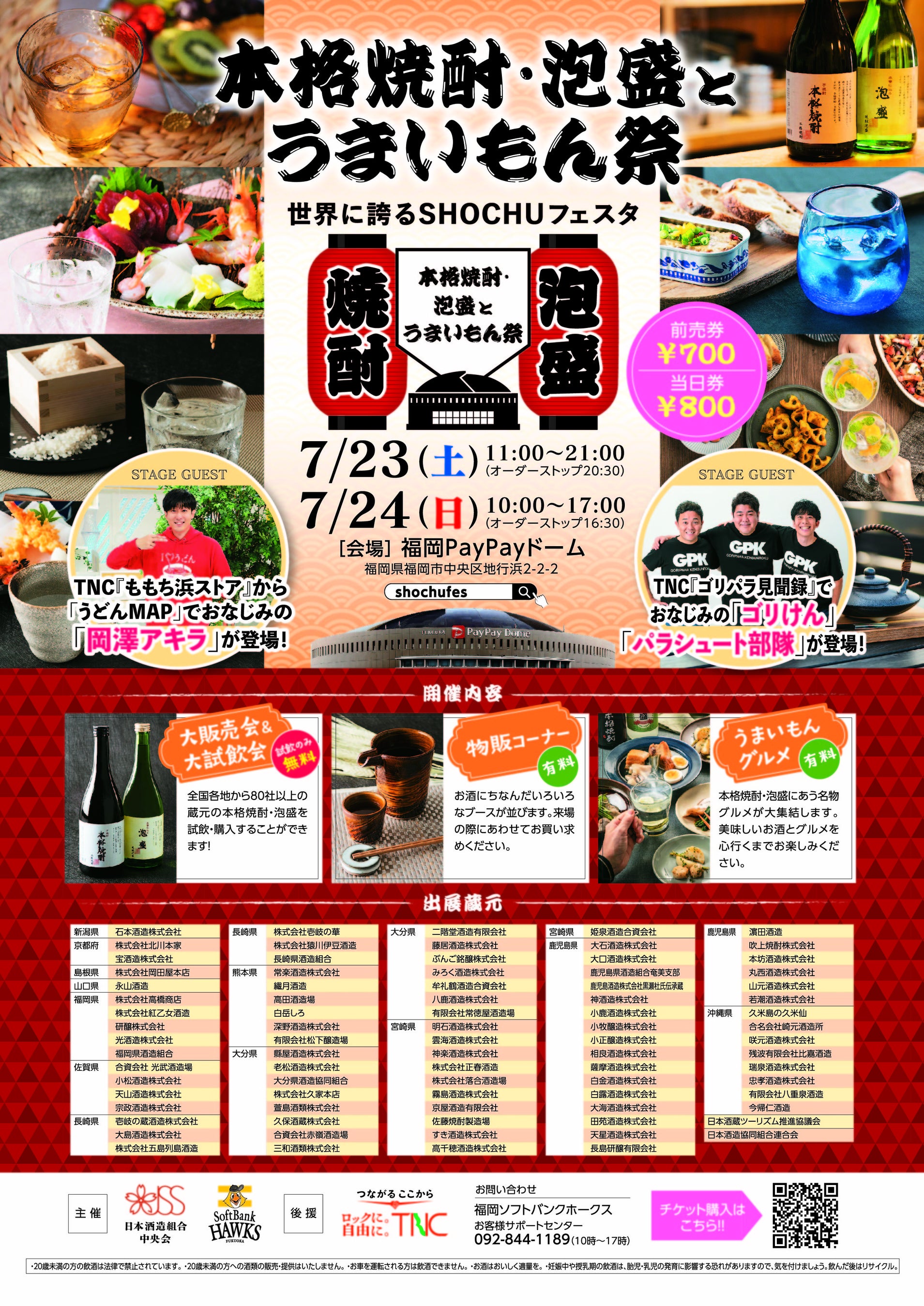 日本酒造組合中央会と福岡ソフトバンクホークス株式会社が主催の本イベントでは、九州に拠点を置く蔵元をはじめ、新潟や京都、沖縄など全国から80社以上が集結し、自慢の本格焼酎や泡盛を販売します。また、「本格焼酎・泡盛とうまいもん祭」を盛り上げるため、ステージイベントを実施します。