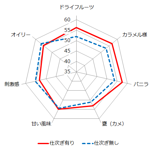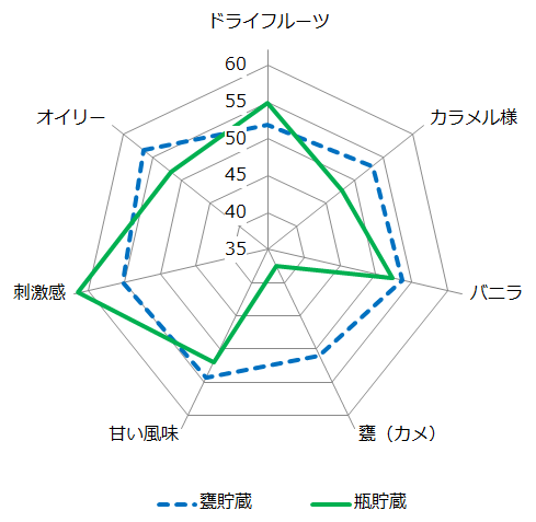 瓶貯蔵に比べると、甕貯蔵の方が「刺激感」が低く、カラメル様が強い傾向が見られ、甕貯蔵と瓶貯蔵では異なる酒質特性に熟成しているということが明らかに。