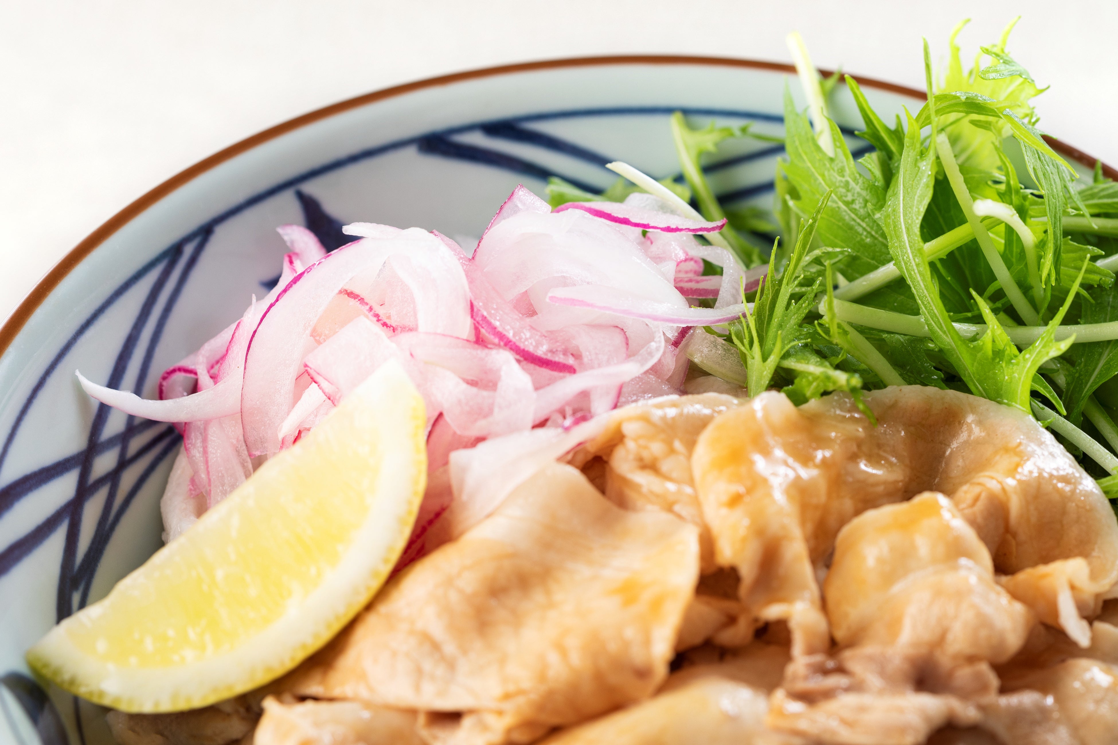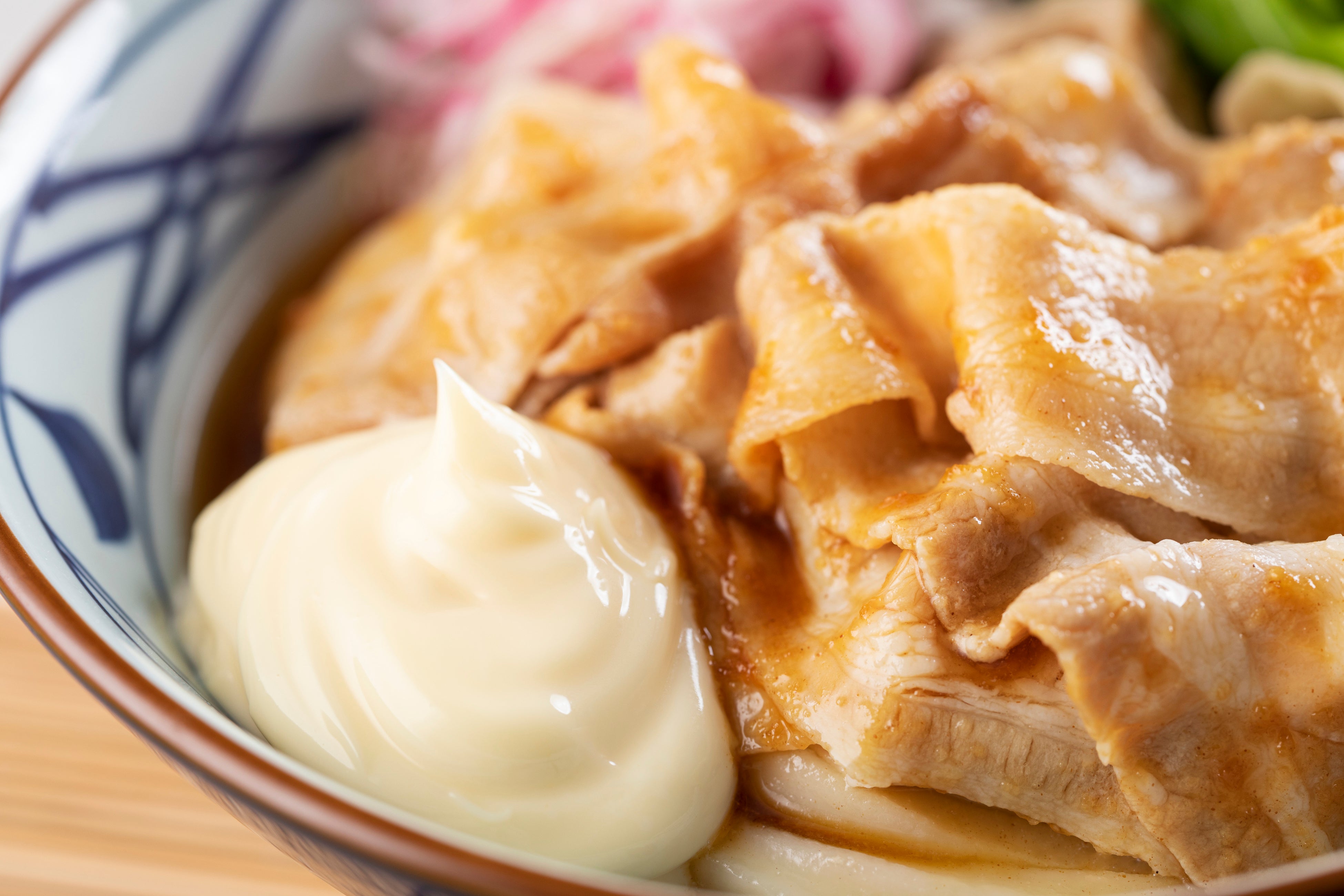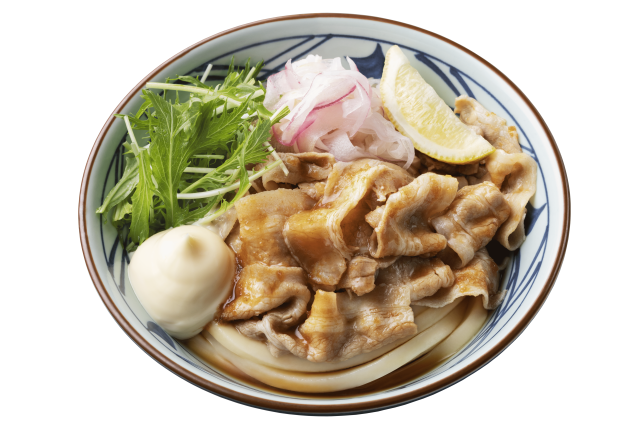 つるつるとのど越しの良い冷たいぶっかけうどんの上に、にんにくの効いた特製旨だれを和えたやわらかい豚しゃぶをどっさりとのせ、そこに、マヨネーズのコクが合わさり、やみつきになる濃厚な味わいに。さらに、甘酢で和えたたまねぎ、シャキシャキの水菜、レモンがもたらすさっぱりとした味わいが加わり、一杯でがっつりとさっぱりの両方を堪能できる夏にぴったりのひと品です。