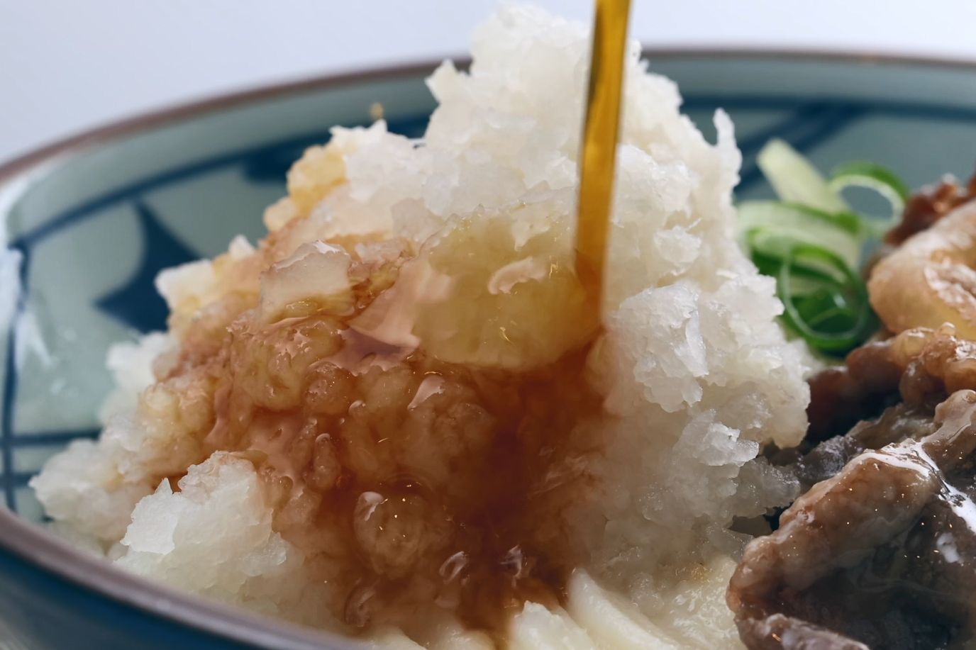 大根を粗くおろした鬼おろしをひと噛みすれば、シャキシャキとした食感、大根本来の風味やみずみずしさが口いっぱいに広がります。仕上げのぽん酢は、さっぱりとした酸味と柑橘の爽やかな香りをもたらし、うどん全体の味を引き締めてくれます。夏ならではの爽快感をご堪能いただけます。