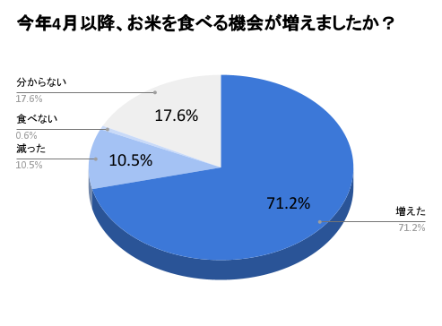 小麦を中心に食品価格の高騰が相次ぐ中、当社が実施したアンケートでは「今年4月以降お米を食べる機会が増えた」という回答が7割を超える結果となっており、価格が据え置かれているお米回帰が進んでいます。