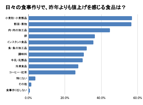 当社が本年7月11日から食品宅配を利用するお子様がいるご家庭を対象に実施したアンケートによると、日々の食事作りをする中で、小麦粉や小麦製品(パン・パスタ)、青果、肉・肉加工品では半数以上の方が値上げの影響を実感していることが分かりました。