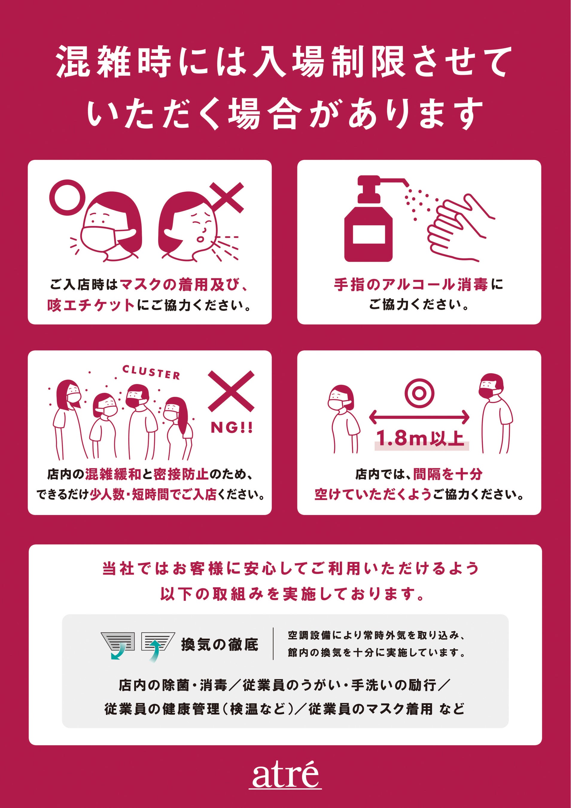 アトレでは、お客様ならびに従業員の健康と安全に配慮し、新型コロナウイルス感染防止対策として以下の取組みを実施しております。