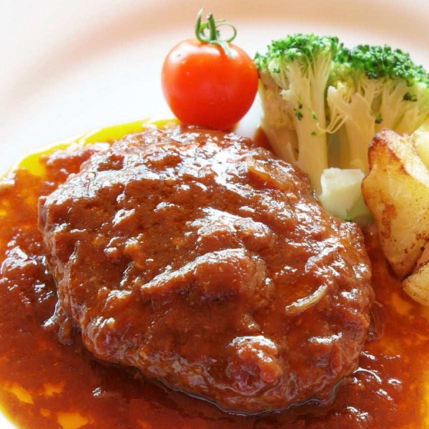 牛肉と豚肉を黄金比率で合わせ、スパイスや玉ねぎを独自の配合でブレンドしたやわらかく食べ応えのある肉汁たっぷりのハンバーグに、厳選した香味野菜と香辛料、赤ワインなどを12時間以上じっくり煮込んで作り上げた王道の特製デミグラスソース