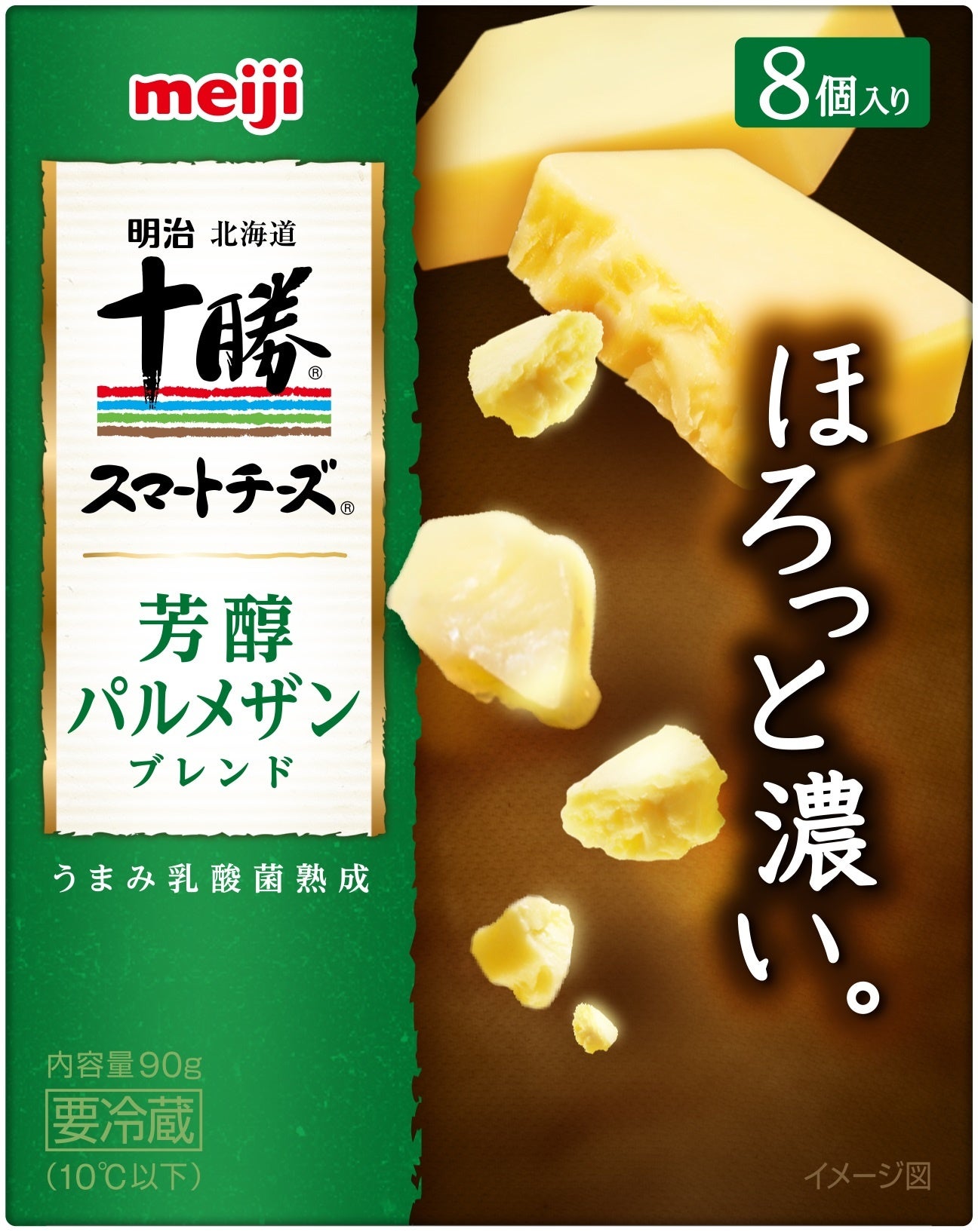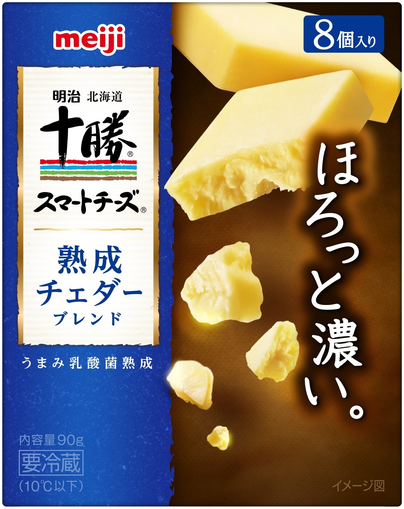 明治独自の「うまみ乳酸菌熟成」技術によって実現した、「濃厚なうまみ」と、「ほろほろ」とほどけるような口どけをお楽しみいただける、全く新しいおいしさのチーズです。スマートに食べられる薄型ひとくちサイズにしました。明治オリジナルの国産ナチュラルチーズ「十勝うまみ濃厚チェダー」をブレンドしています。(チーズ分中30%以上)