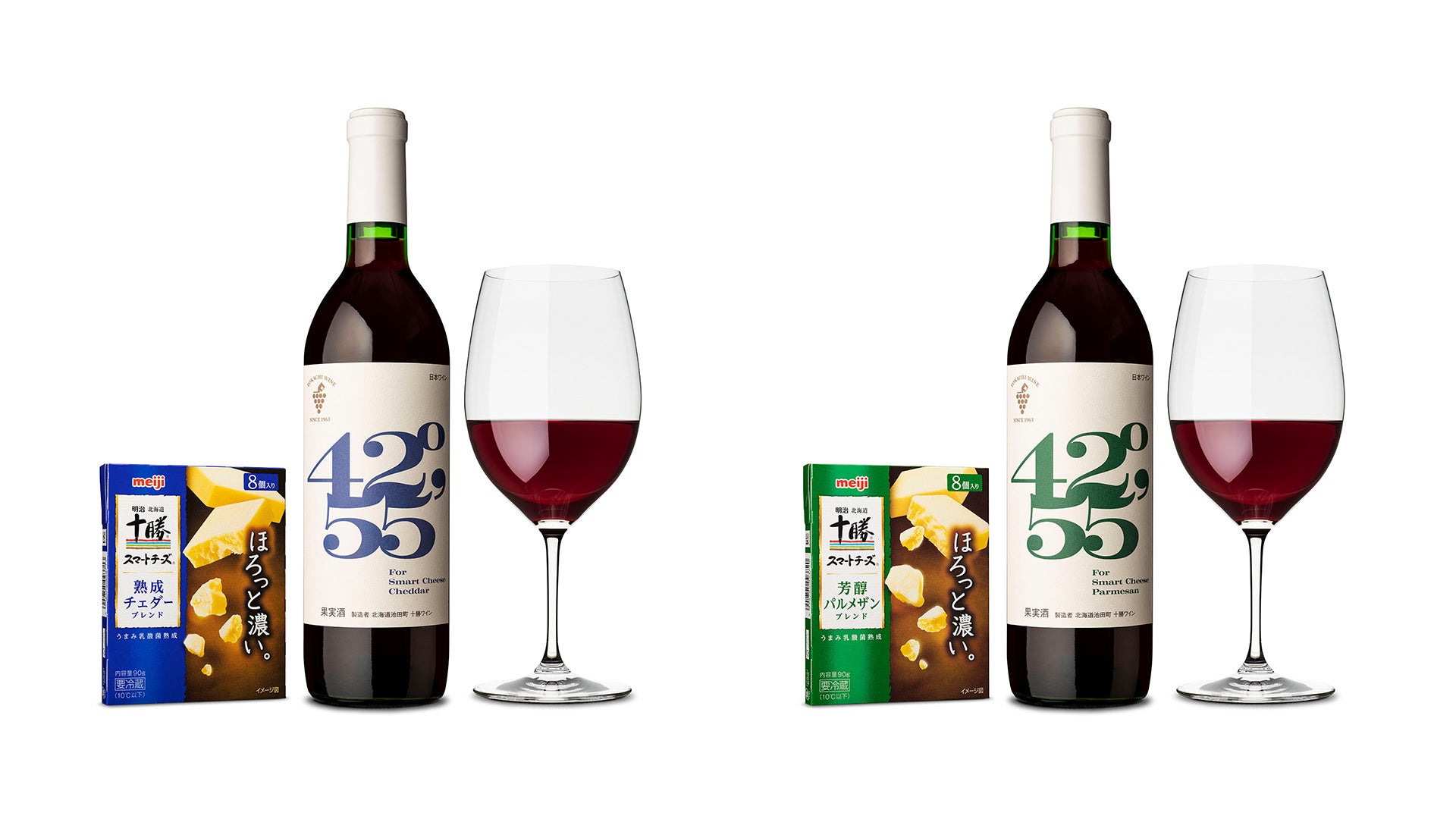 濃厚なうまみの「熟成チェダーブレンド」との相性のよさを追求した「42°55’ For Smart Cheese Cheddar」は、池田町独自の交配品種であるブドウ「山幸種」を使用。山ブドウ譲りの野趣あふれる独特なアロマと、キレのある酸味と深みのあるコクが特長です。また、芳醇な香りが特長のスマートチーズ「芳醇パルメザンブレンド」に合わせた「42°55’ For Smart Cheese Parmesan」は、「山幸」と十勝の代表品種である「清見」のブレンドが奏でる、複雑なアロマとまとまりのある味わいが楽しめます。