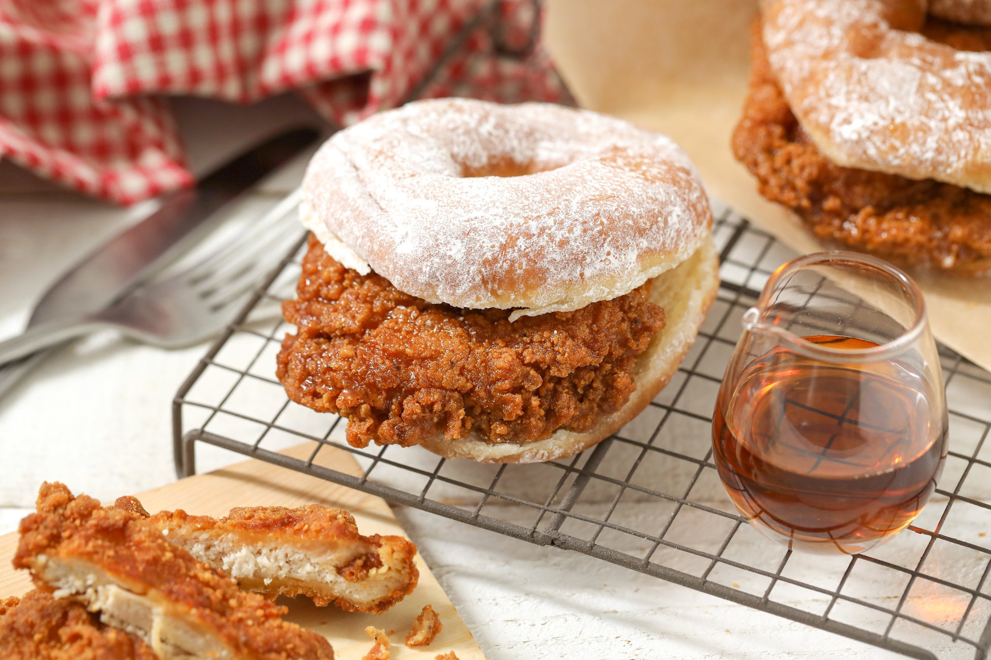 ふわっと軽い食感のシュガードーナツに、メープルシロップを絡めたサクサクでジューシーなフライドチキンを挟んだドーナツバーガーです。