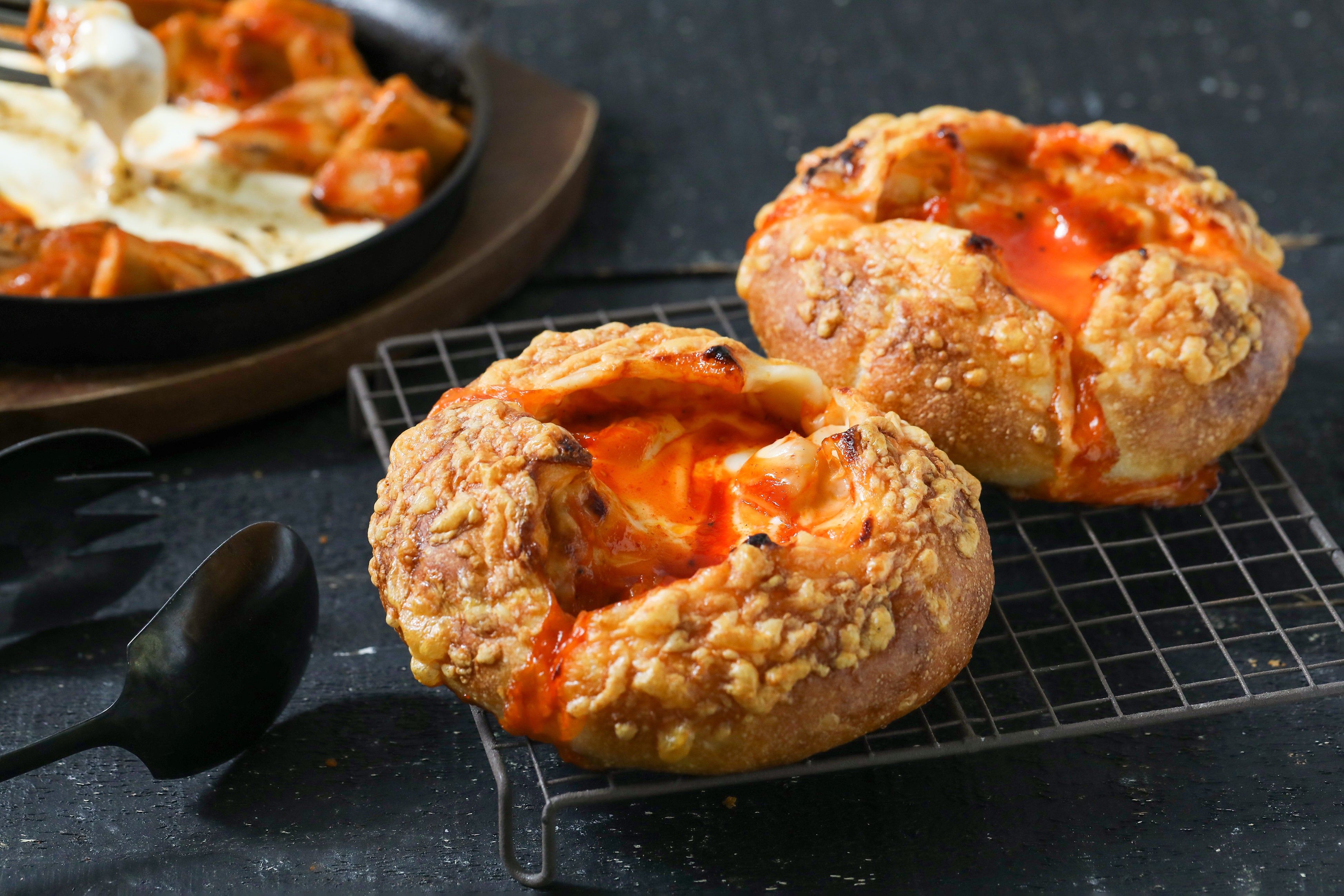 甘辛く濃い味付けのチキンと、チーズのまろやかでコクのある味わいが絶妙にマッチ。また、カリッとした食感のフランスパンとごろっとしたジューシーなチキン、とろりとしたチーズの食感のアクセントもお楽しみいただけます。チーズタッカルビの旨みと甘辛い味わいをぜひご賞味ください。