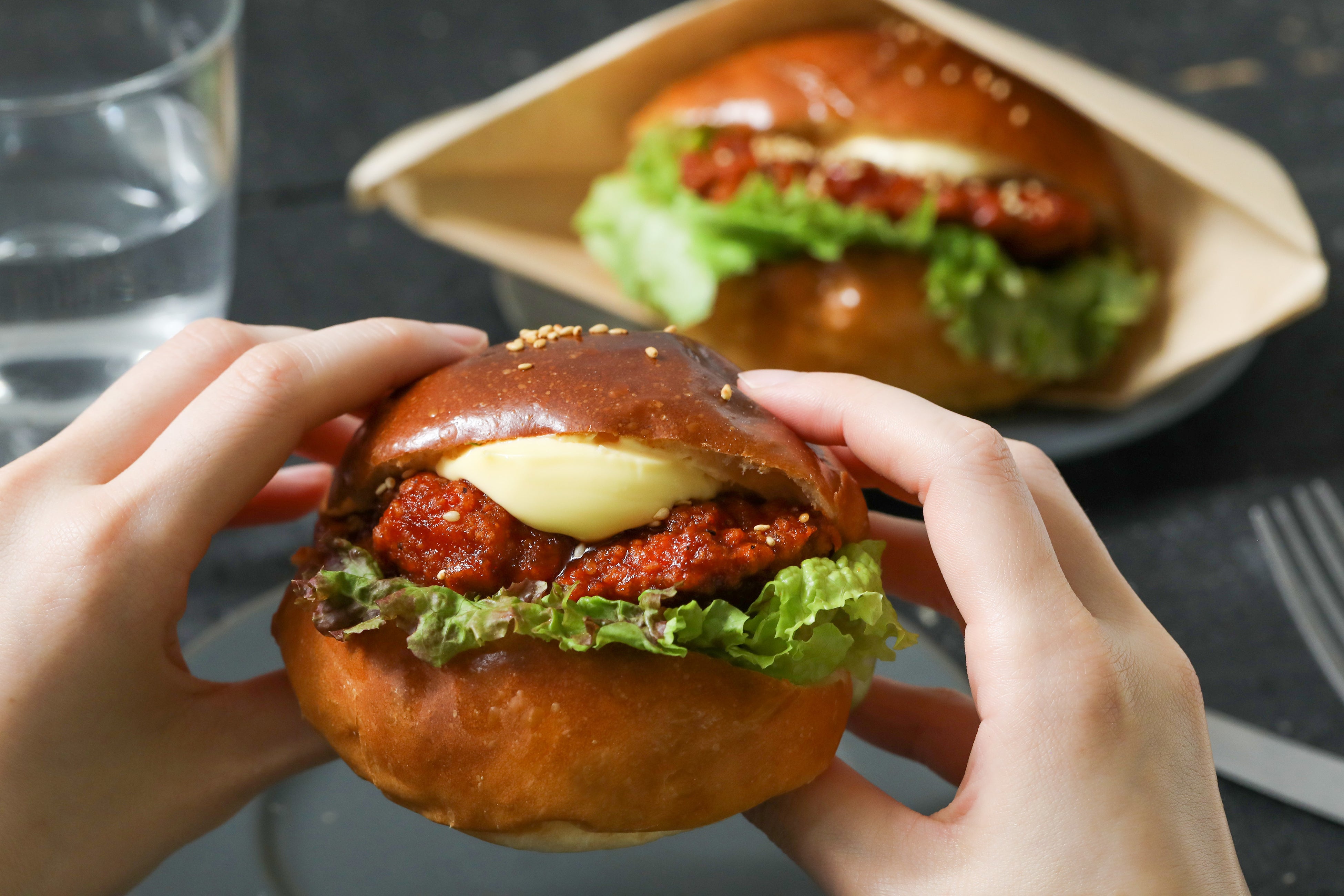 サクッとした衣、中はやわらかくジューシーなフライドチキンを挟み、スパイシーなコチュジャン入りのタレでピリ辛に味付けた韓国風のバーガーに仕上げました。