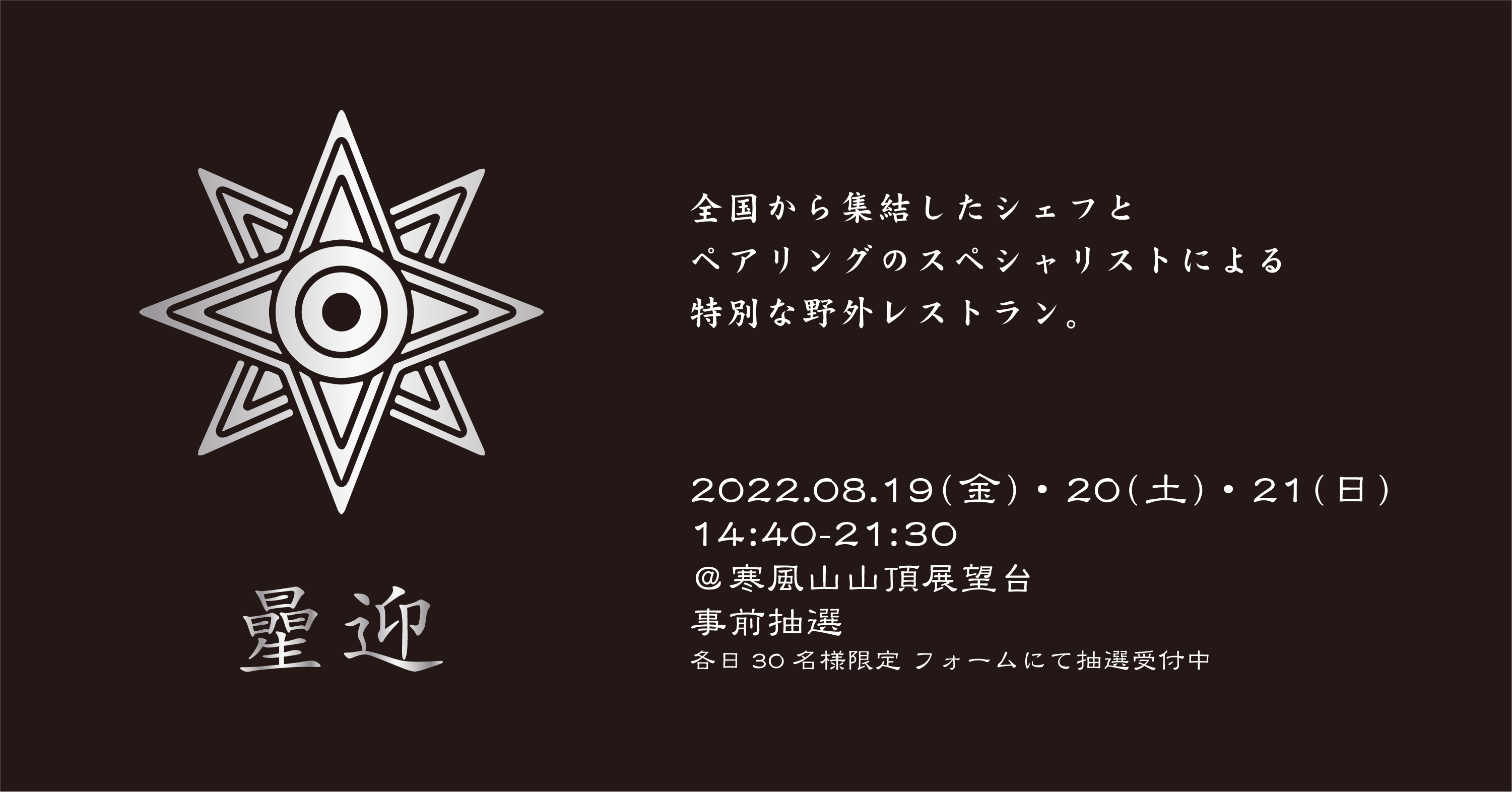秋田県男鹿のクラフトサケ醸造所「稲とアガベ株式会社」所在地:秋田県男鹿市船川港、代表:岡住修兵)は、日本全国のシェフ6名とペアリングのスペシャリスト5名が3日間限定の野外レストラン”曐迎(ほしむかえ)” を8月19日(金)・20日(土)・21日(日)の3日間、寒風山山頂展望台にて各日抽選30名限定でオープンします。ここでしか味わうことができない特別なコースディナーを提供します。