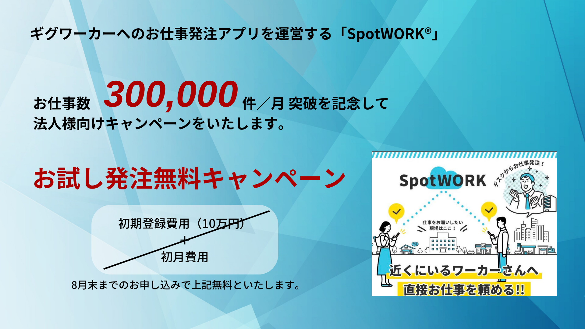 企業や団体が作業したい地域の住民に業務を依頼できるクラウドソーシングサービス「SpotWORK®︎」https://spotwork.net/ を全国展開(注)するSpotWORK株式会社(本社:東京都中央区)は2022年6月にお仕事数が月間30万件を突破いたしました。今回、記念して法人様向けに「お試し発注無料キャンペーン」を実施いたします。