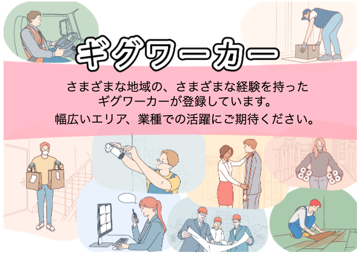 ※ギグワーカーとはネットを通じて、単発で仕事を請け負う方々で、様々な地域の、様々な経験を持ったワーカーさんが登録しており、仕事の依頼が可能です。