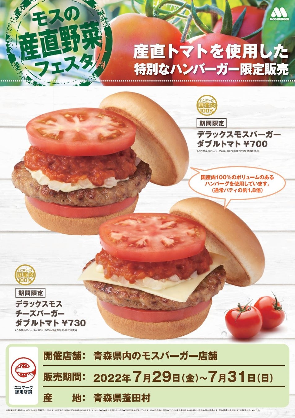 モスバーガーを展開する株式会社モスフードサービス(代表取締役社長:中村 栄輔、本社:東京都品川区)は、2022年7月29日(金)~7月31日(日)の3日間、青森県のモスバーガー全13店舗で、生のトマトを使った全ての商品に青森県産の産地直送トマトを使用する『モスの産直野菜フェスタ』を実施します。また、地域・期間限定の商品も販売します。