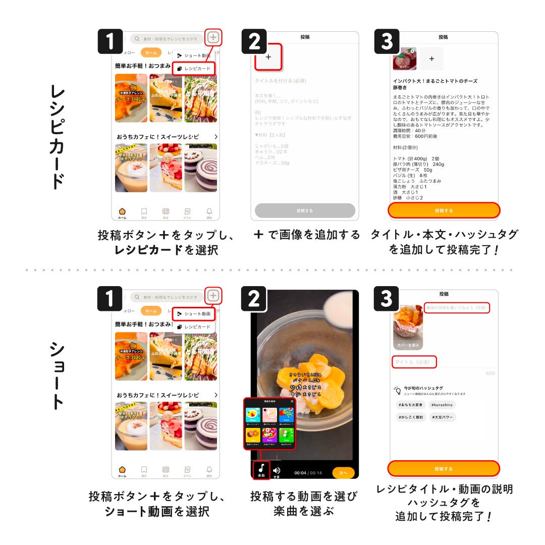 本コンテストは、「クラシル」のショート動画投稿機能を用いて、ユーザーに「ショート動画」を投稿していただき、指定期間のPV数によってランキングを決定します。