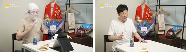 今回、「サッポロ うまみ搾り」と初コラボとなるコウメ太夫さん。撮影が始まると、独特な間の取り方やリズムの取り方など普段のネタでは見られないアレンジの効いたネタに、スタッフが思わず笑い声を上げてしまいNGになりかける場面も。撮影の合間には「ムーンウォークを見せてもらえますか」というスタッフのオーダーに、戸惑いながらも快く披露してくれた優しいコウメ太夫さんの一面が垣間見えました。撮影は順調に進み、終始笑いの絶えない現場となりました。