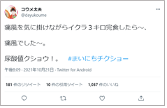 新WEBムービーは、コウメ太夫さんが毎日Twitterに投稿している「#まいにちチクショー」のネタの中で、2021年10月の「痛風を気に掛けながらイクラを3キロ完食したら~、痛風でした~。尿酸値クショウ!。」という尿酸値とかけた投稿を当社の担当者が発見し、「サッポロ うまみ搾り」とのコラボを提案。コウメ太夫さんの「尿酸値をケアして、もっと好きなものを食べたいのに…チクショー!!」という想いが合致し、本企画が実現しました。