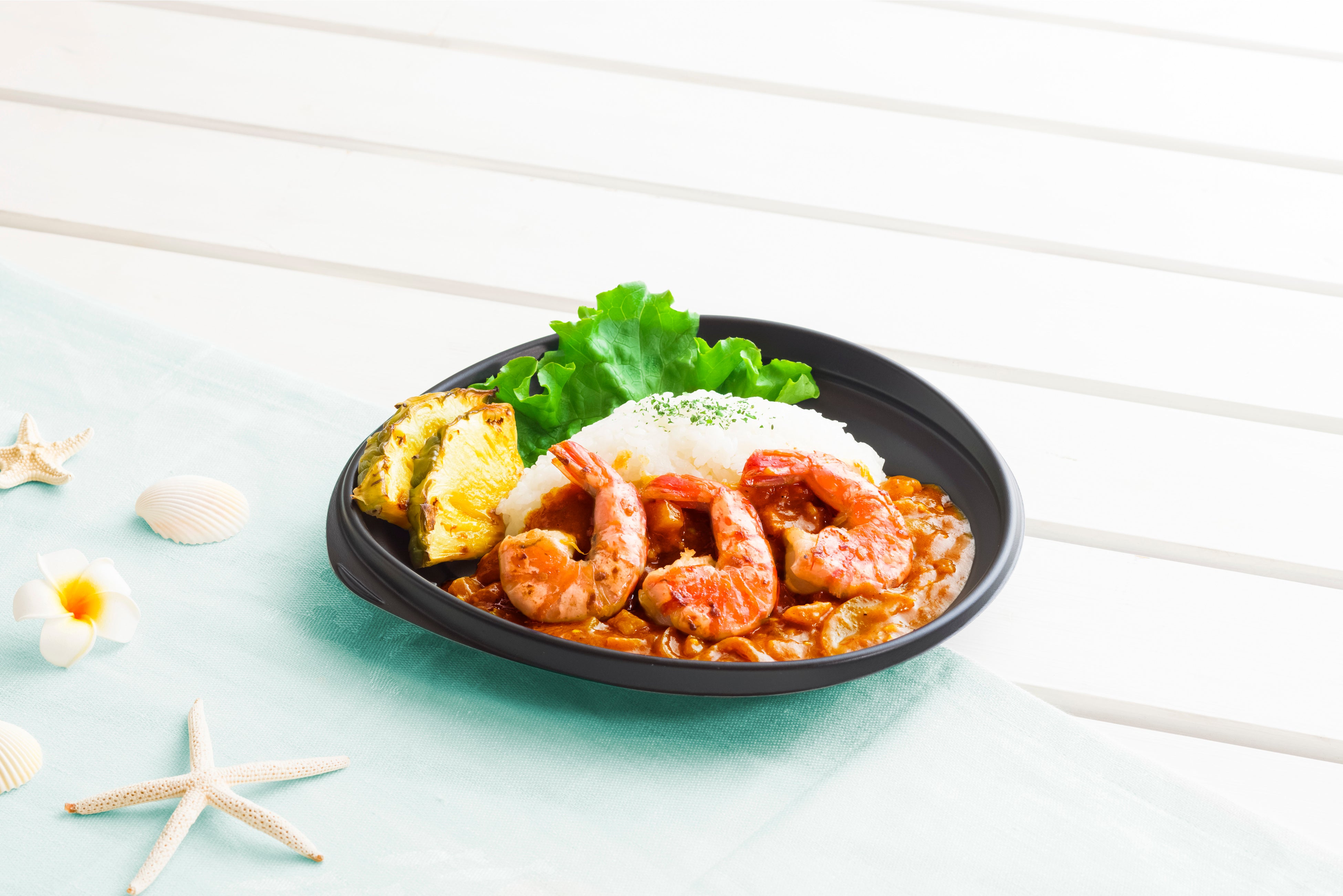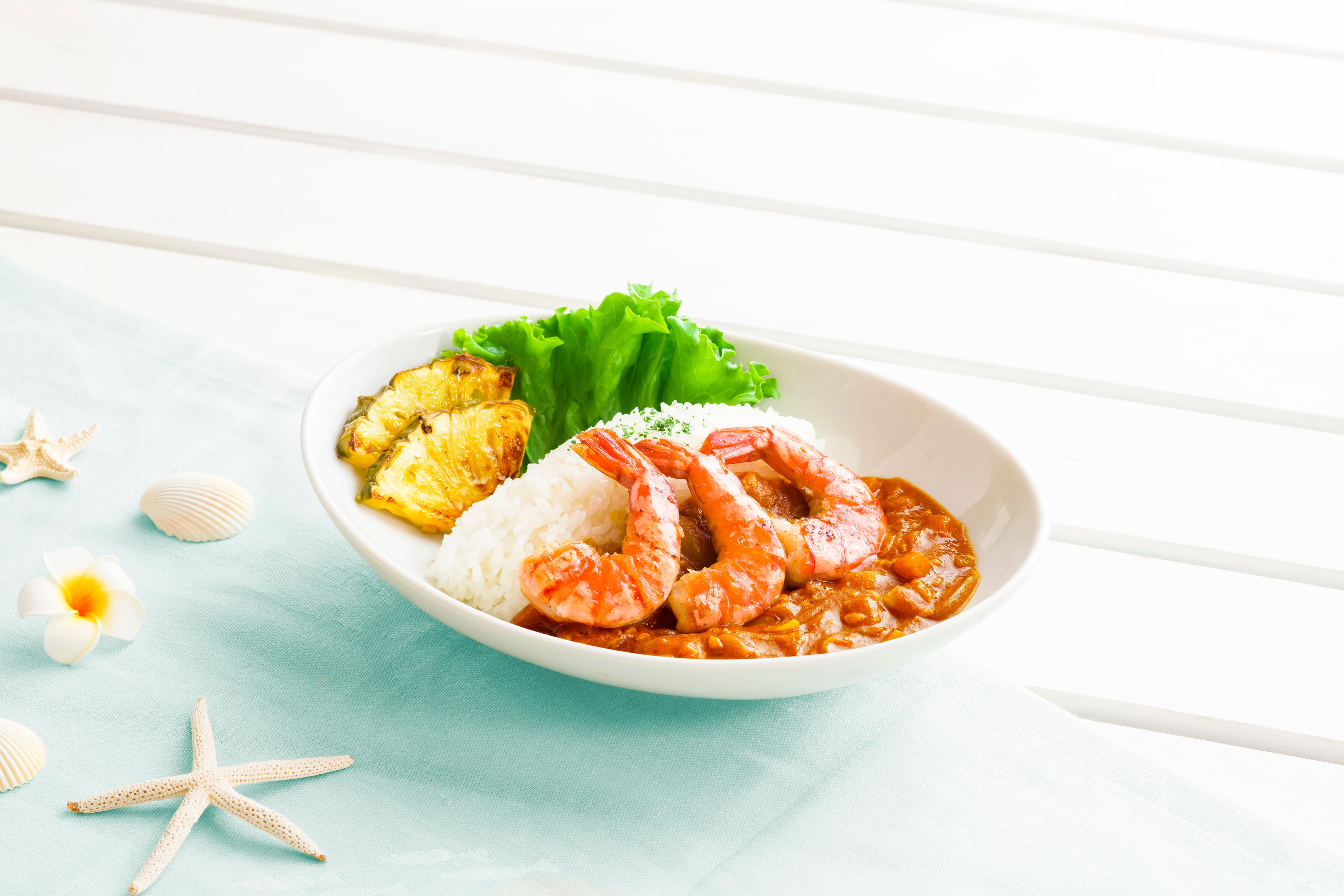 パイナップルを加えたカレーに人気のガーリックシュリンプをトッピング。