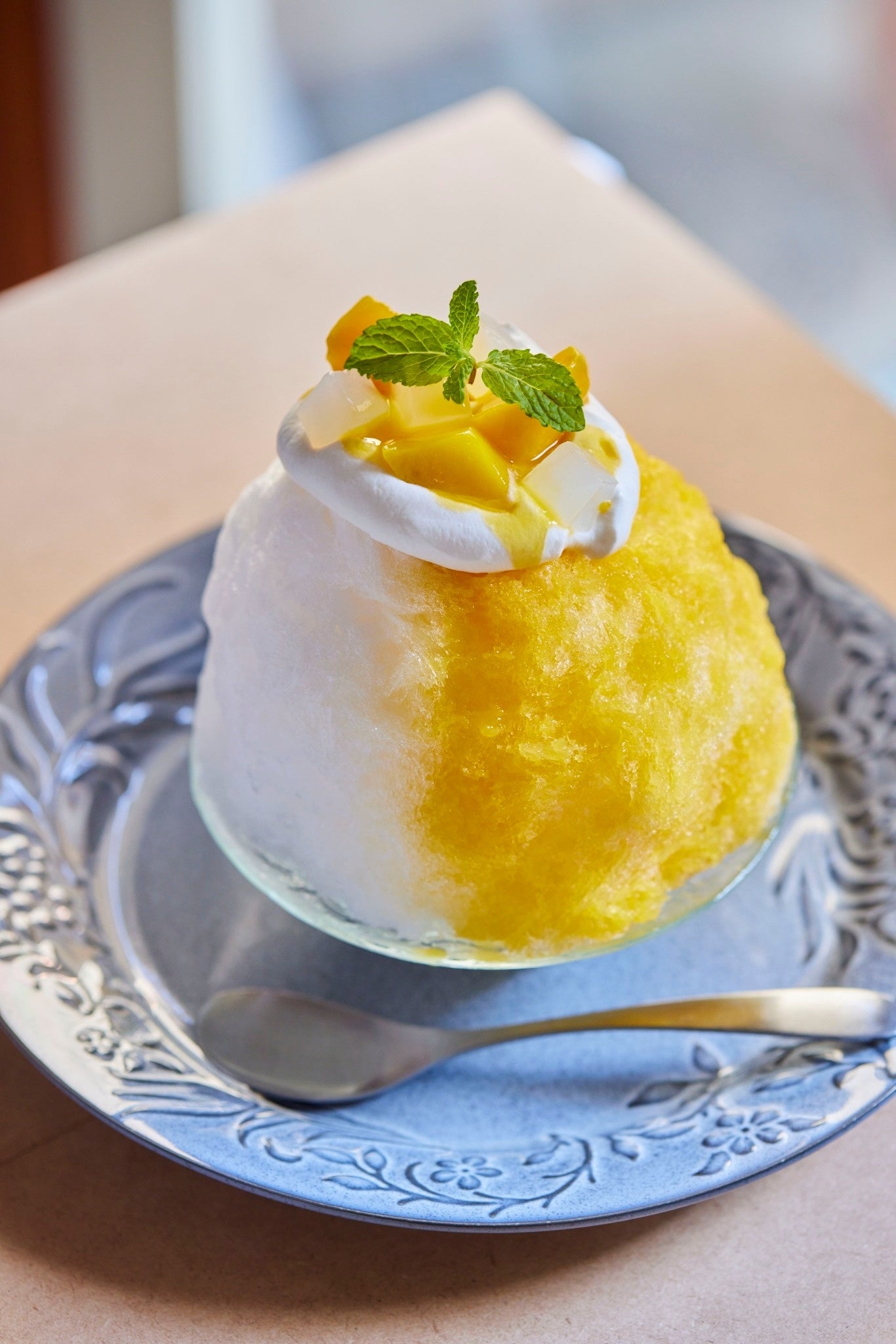 自家製アーモンドミルクシロップをたっぷり染み込ませたフワフワのかき氷にアーモンドミルクホイップ。濃厚なマンゴーとレアチーズ風クリームの美味しさがつまった、最後まで飽きさせないトロピカルで贅沢なスイーツかき氷。