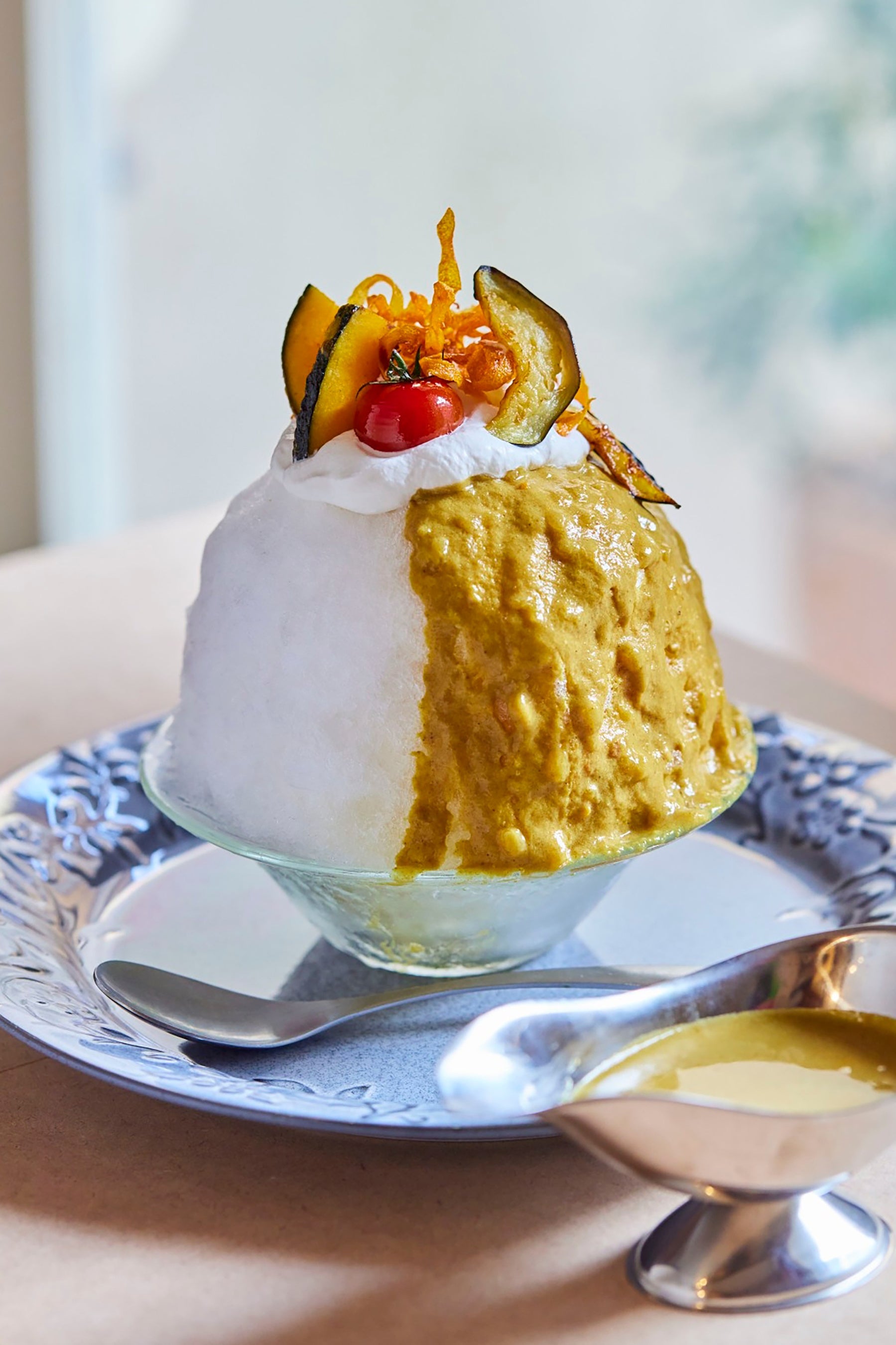 カレーのスパイシーさとアーモンドミルクの優しい甘味…あまじょっぱループに落ちたらスプーンが止まらない!スパイシーな中にアーモンドミルクの甘み感じるカレーソースと、アーモンド&ココナッツホイップの甘さが驚きの相性のよさ!最先端のかき氷です!
