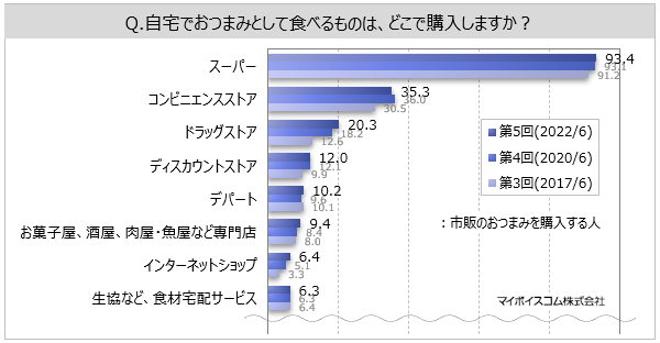 ■おつまみの購入場所は、「スーパー」が購入者の9割強、「コンビニエンスストア」約35%、「ドラッグストア」2割