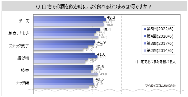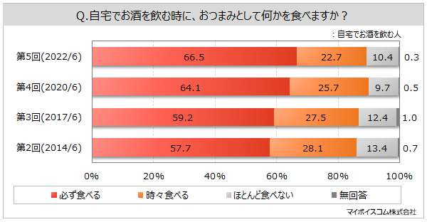 | <今 回>(2022/6)https://myel.myvoice.jp/products/detail.php?product_id=28704 ※上記設問の他に、「おつまみを食べながら飲むお酒の種類」も聞いています。 <第4回>(2020/6)https://myel.myvoice.jp/products/detail.php?product_id=26303 <第3回>(2017/6)https://myel.myvoice.jp/products/detail.php?product_id=22705 |