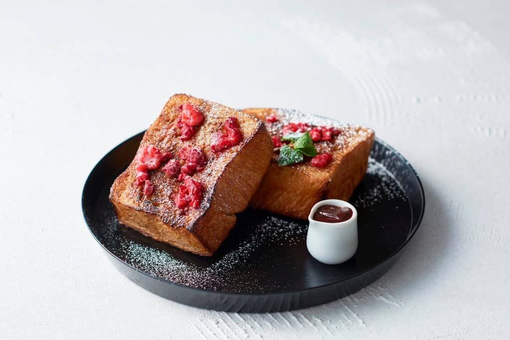 GODIVA caféオリジナルのカカオミルクに浸したブリオッシュを香ばしく焼き上げ、甘酸っぱいフランボワーズを添えました。お好みでチョコレートソースをかけてお召し上がりください。