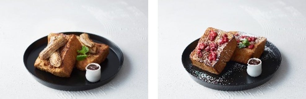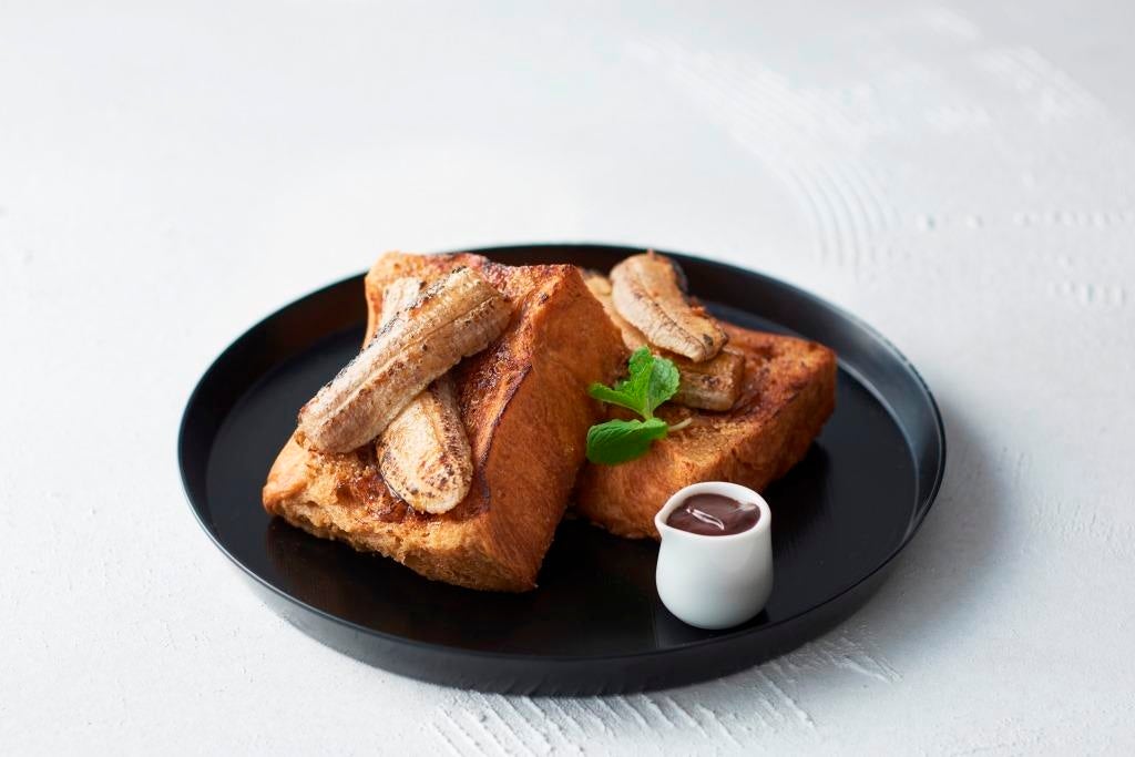 GODIVA caféオリジナルのカカオミルクに浸したブリオッシュを香ばしく焼き上げ、ローストバナナを添えました。お好みでチョコレートソースをかけてお召し上がりください。