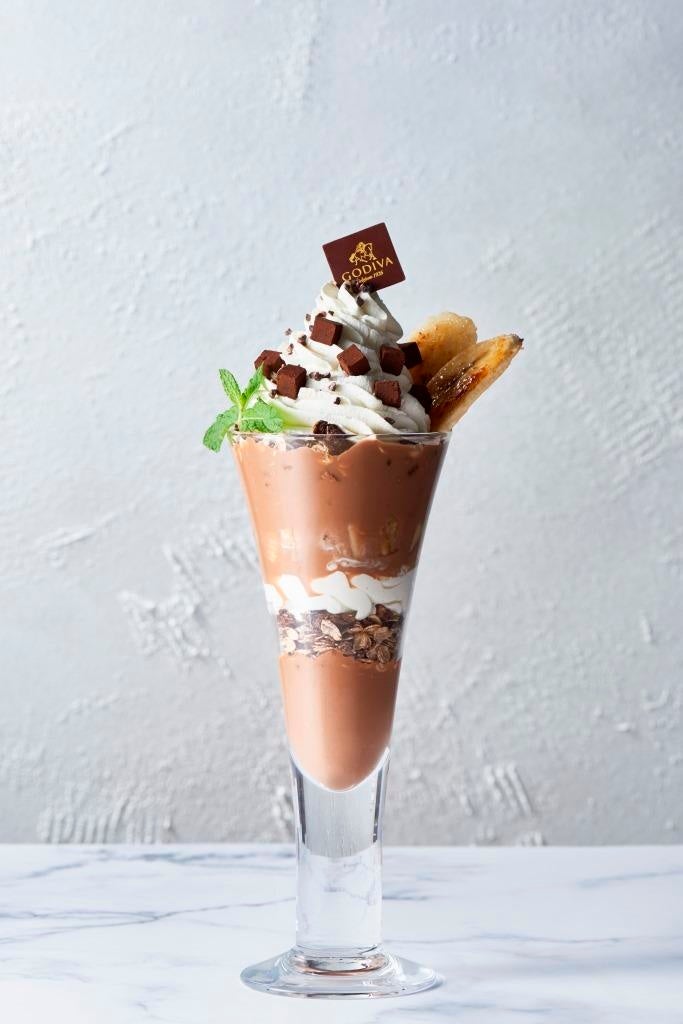 ゴディバのチョコレートを使用したソフトクリームやジュレ、オーツ麦やカカオニブを幾重にも重ねました。たっぷりのホイップと生チョコレートにキャラメリゼしたバナナを添えて。