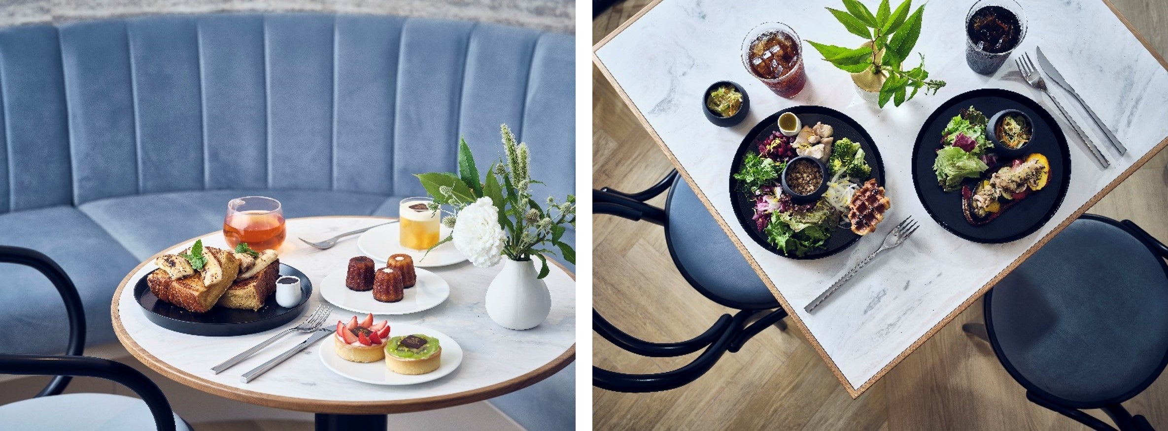 店内は、温かみのある木とグリーンを中心に、ゆったりとくつろいで頂ける居心地の良い空間となっています。品のあるブルーの家具とリズミカルに配置された象徴的なライトが、カフェで過ごすひとときをより特別な時間へと演出します。