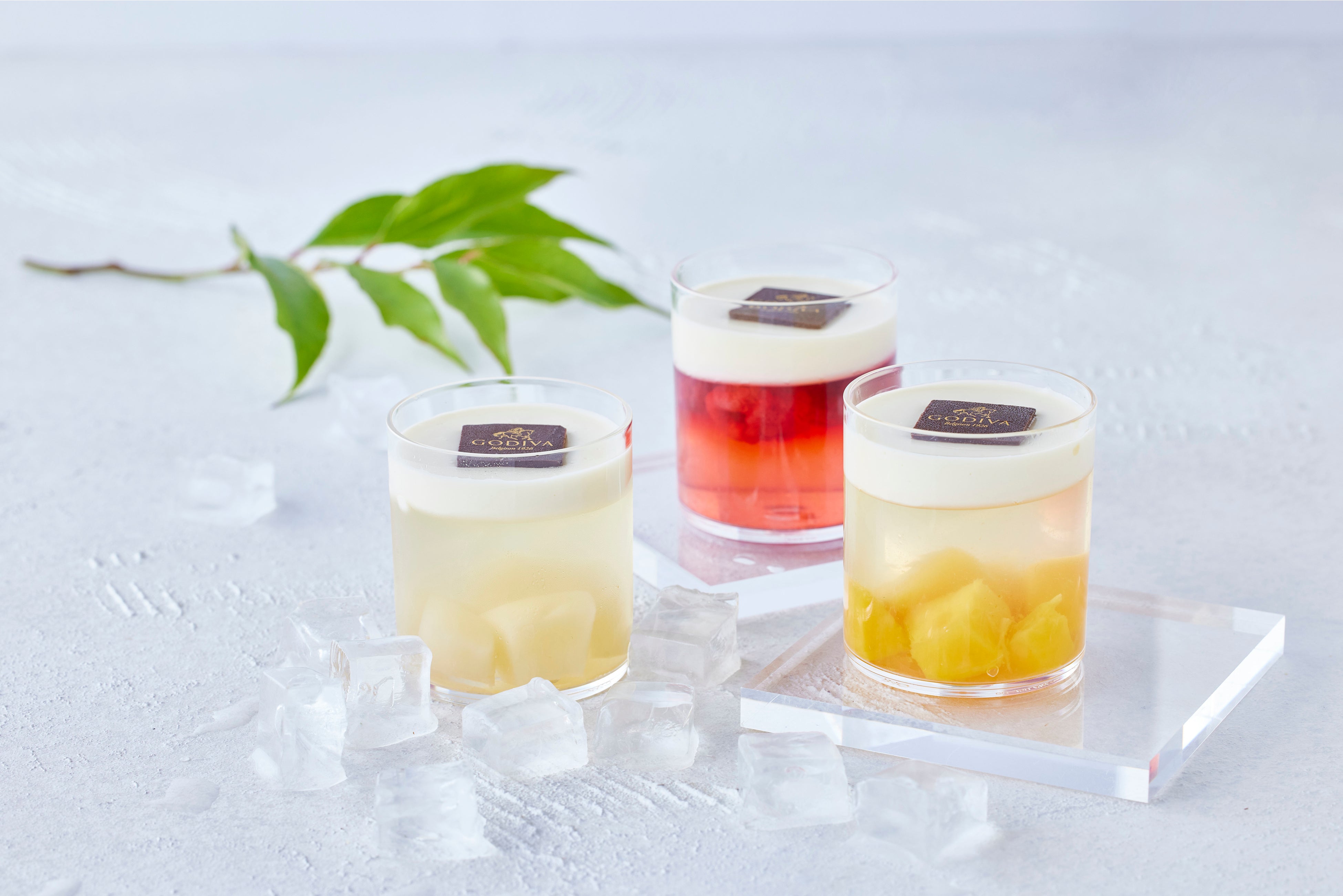 ゴディバのホワイトチョコレートを使用したパンナコッタと、フルーツゼリーを2層仕立てにしました。