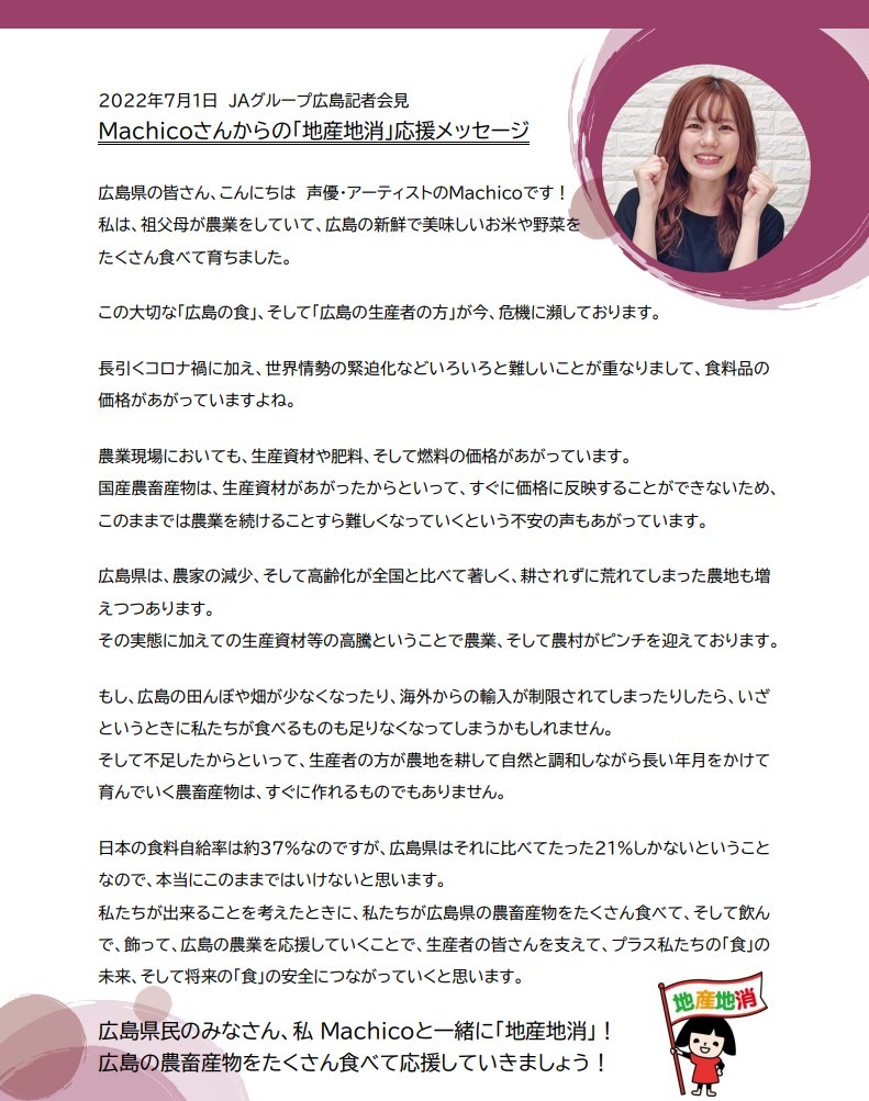 JAグループ広島(所在地:広島県広島市中区大手町4-7-3、代表理事会長:忠末宜伸)は、広島県の農家出身で、「食」をテーマにした「デリシャスパーティー プリキュア」のOP主題歌や「ウマ娘 プリティーダービー」のトウカイテイオー等で活躍されている、声優・アーティスト「Machico」さんと連携し、7月よりJAグループ広島の「地産地消」を訴求する広報活動を開始いたしました。