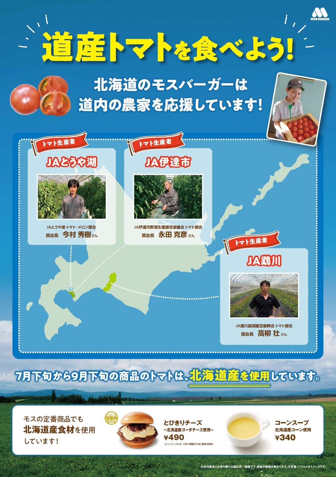 今回の「道産トマトを食べよう!」では、道内のモスの協力農家※である『JA伊達市トマト部会』、『鵡川蔬菜園芸振興会 トマト部会』及び『JAとうや湖トマト・メロン部会』で採れたトマトを使用します。伊達市ととうや湖町からはふっくらとした丸い形で、糖度と酸度のバランスが良い『桃太郎』という品種を使用します。むかわ町からは色味や食味、肉質の良さが特徴の『りんか409』と、ふっくらと丸みのある形で糖度と酸度のバランスが良い『麗月』という2種類の品種を使用します。どの品種も爽やかな香りとみずみずしさを感じられ、モスバーガーの商品と相性抜群なおいしいトマトです。