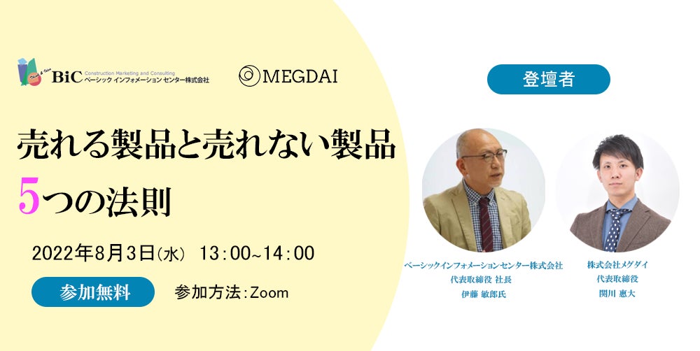 ベーシックインフォメンションセンター株式会社の代表 伊藤敏郎と株式会社メグダイの代表 関川惠大が共同オンラインセミナーを7/21(木)13時から開催する。参加費は無料なので、ご興味がある方はぜひご参加ください。