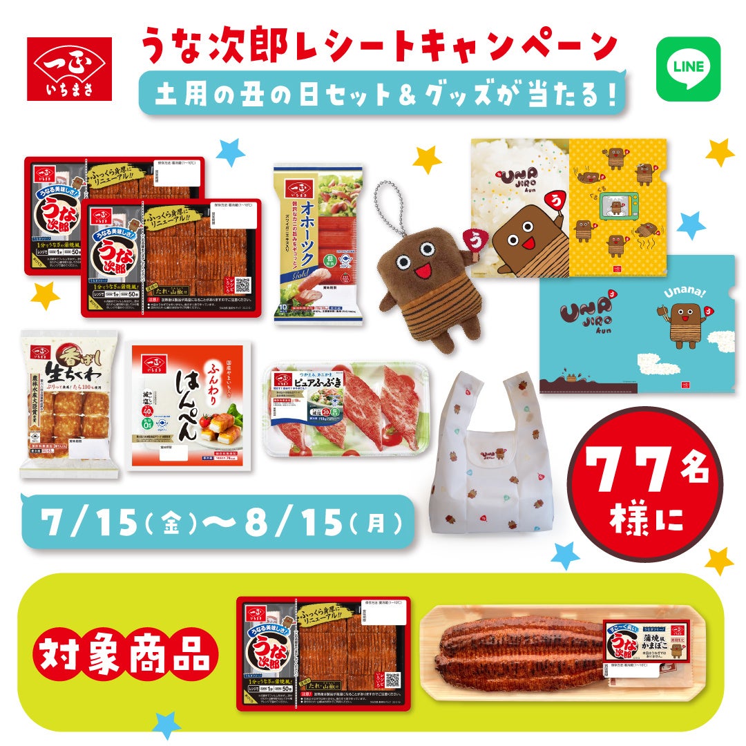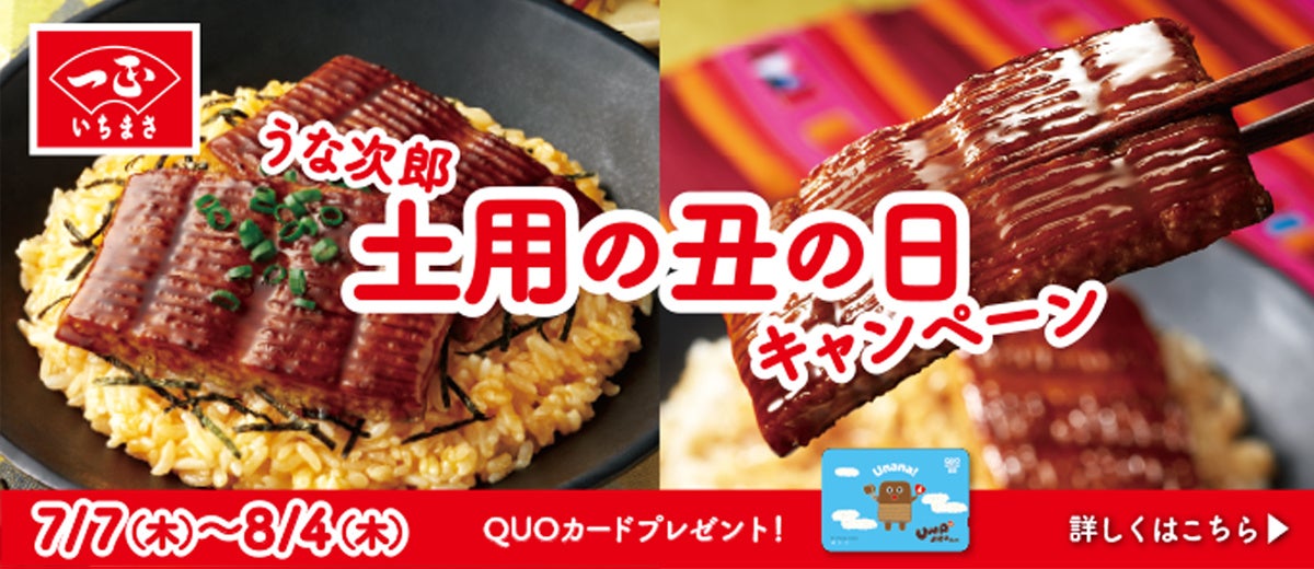 夏の土用の丑の日(7月23日、8月4日)に合わせて、いちまさオンラインショップ限定で「うなる美味しさうな次郎 長持ちパック」などの対象商品が10%OFFで購入できるキャンペーンを開催中です。さらに、対象商品を含めて2,000円(税込)以上の商品をご注文いただいた方の中から抽選でうな次郎くんQUOカードをプレゼント!
