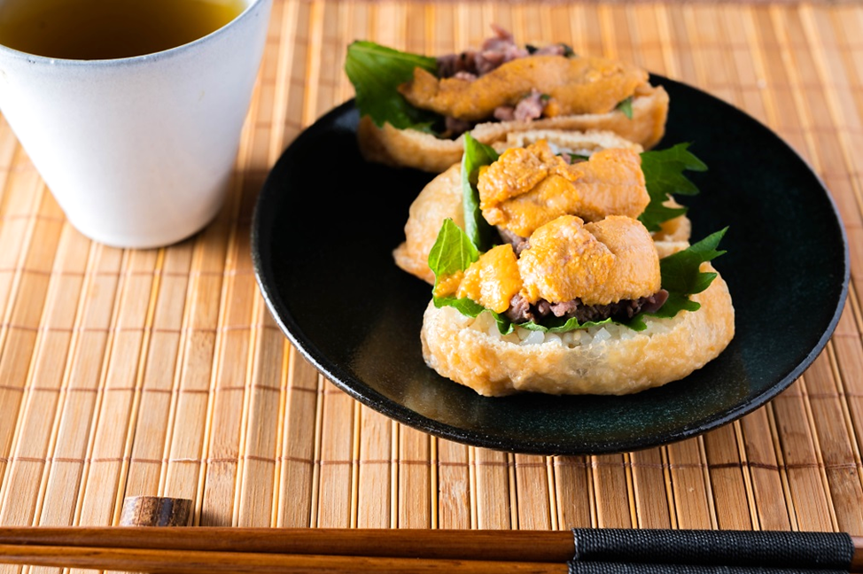 柚子酢飯に肉タルとうにがのった贅沢いなり。大葉がアクセントになっています。お肉と海鮮の贅沢いなりは、さっぱりとした味わいもあり何個でも飽きずに食べられます!