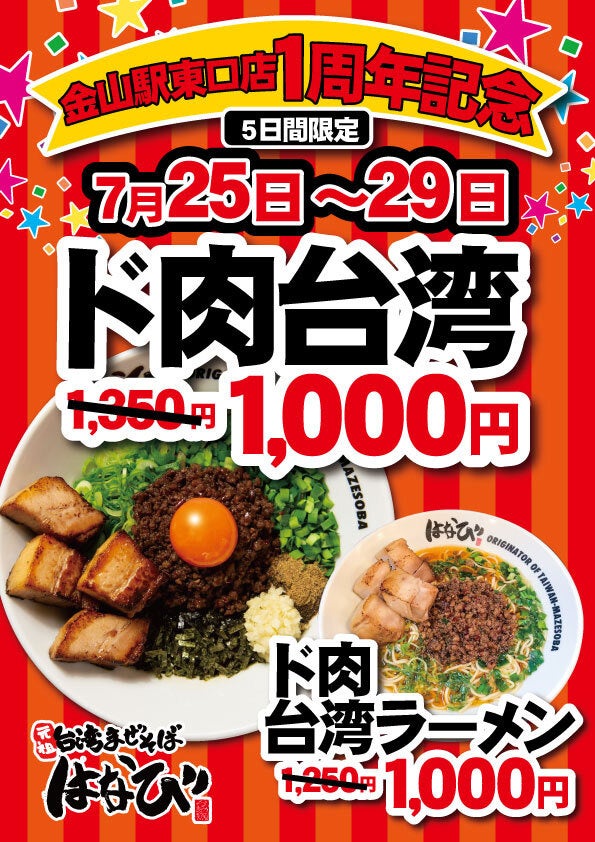 飲食店を中心に事業展開する株式会社ヴィア・ホールディングスの子会社である株式会社扇屋西日本(東京都新宿区 代表取締役社長:中井 次郎)が運営する「麺屋はなび金山駅東口店」が、おかげさまで、開店1周年を迎えました。この度、1周年を記念して、人気商品の「ド肉台湾まぜそば」「ド肉台湾ラーメン」を1,000円(税込)でご提供致します。「ド肉台湾」とは、存在感がたっぷりのド肉(食べ応え抜群なドデカチャーシュー肉)と、台湾ミンチ(唐辛子とニンニクを効かせた醤油味ピリ辛ミンチ)が、ゴロゴロっとたっぷり乗っている食べ応え十分です。