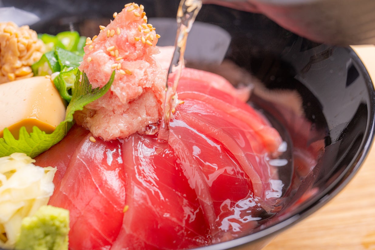 メインの3種類から1品、12種類のトッピングから3品好きなネタをお選びいただきます。さらに、選んだネタだけでは物足りない方も、追加料金でメインの量を2倍にしたり、トッピングの種類を増やしたりすることができます。最後は、熱か冷の一番出汁を贅沢にかけた茶漬けにして、お口の中をさっぱりさせます。自分で選んで作った海鮮丼で味変を楽しめるので、最後まで海鮮の魅力を堪能いただけます。