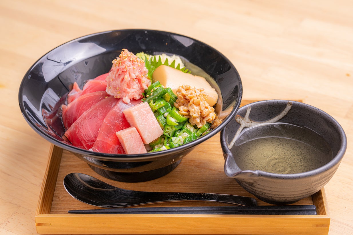 メインの3種類から1品、12種類のトッピングから3品好きなネタをお選びいただきます。さらに、選んだネタだけでは物足りない方も、追加料金でメインの量を2倍にしたり、トッピングの種類を増やしたりすることができます。最後は、熱か冷の一番出汁を贅沢にかけた茶漬けにして、お口の中をさっぱりさせます。自分で選んで作った海鮮丼で味変を楽しめるので、最後まで海鮮の魅力を堪能いただけます。