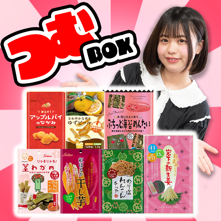 紬さんに選んでいただいたオリジナル商品BOX。茎わかめだけでなく、人気のれんこんチップや干し芋・岩下食品さんとのコラボ商品やドライフルーツなどバラエティ豊かなラインナップとなっています。
