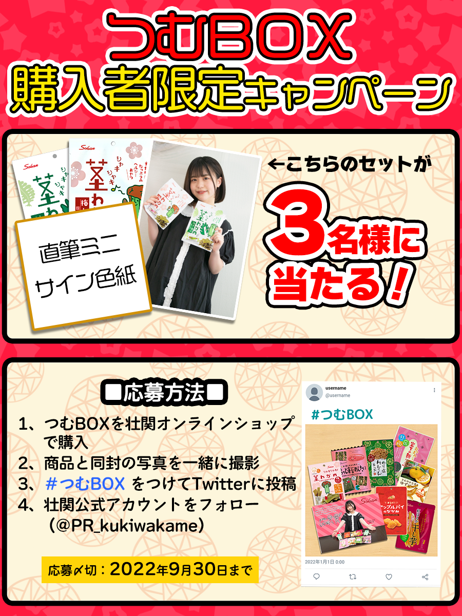 「つむBOX」を購入いただいた方の中から、抽選で合計3名様に、直筆ミニサイン色紙と商品詰め合わせをプレゼント。購入いただいた商品と、BOXに同封されているメッセージ入りフォト用紙を一緒に撮影し、#つむBOXをつけて、ご自身のTwitterにて投稿してください。壮関アカウントのフォロワー様にご参加いただけるキャンペーンです。