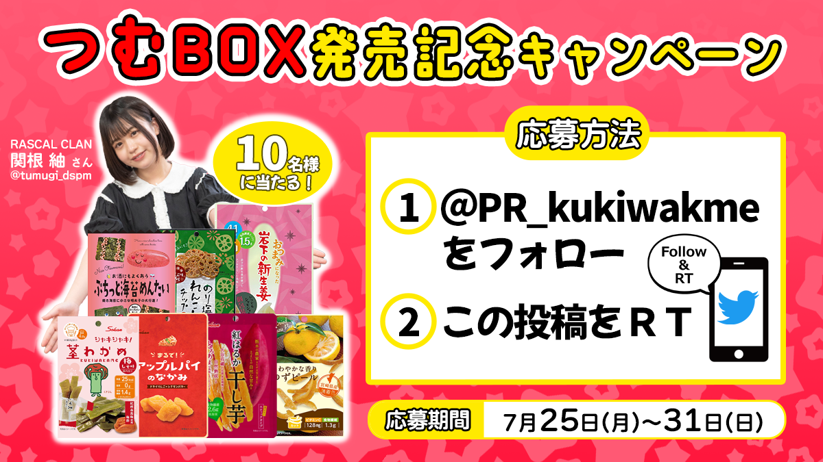 「壮関|sokan 国内加工の茎わかめ」公式Twitter(@PR_kukiwakame)のフォロワー様で、キャンペーン投稿をリツイートしてくださった方の中から、抽選で10名様に「つむBOX」をプレゼントいたします。