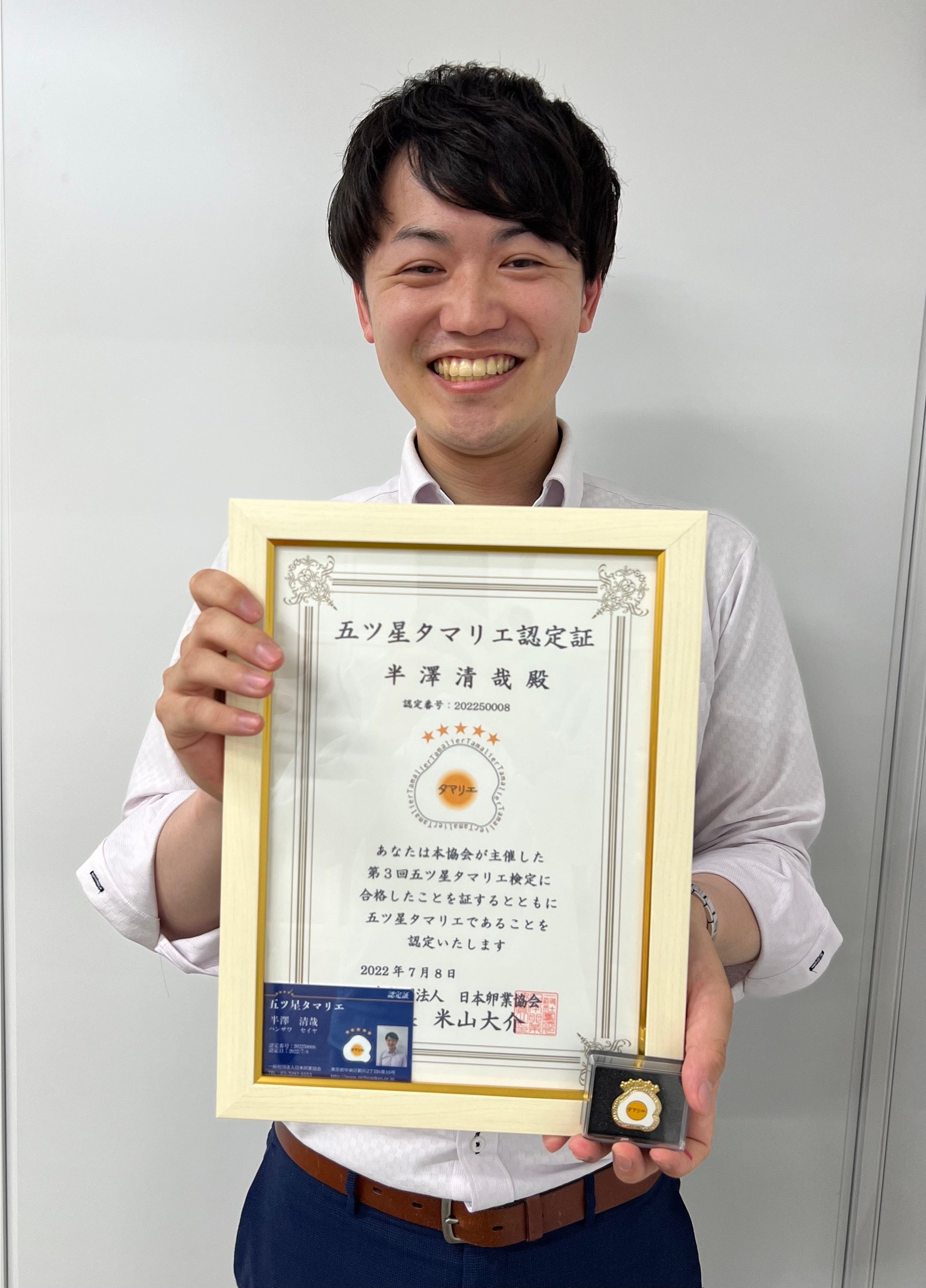 株式会社RISE(本社:神奈川県横浜市、以下「当社」)の代表取締役である半澤清哉が、たまごについての知識を正しく理解した人々に与える称号である「タマリエ」の「一ツ星・三ツ星・五ツ星」の3ランクの資格において、その最高峰である「五ツ星」を認証取得した。今回の認証は日本で7人目の快挙であり、28歳1ヶ月という年齢での認証取得は今回で史上最年少となった。
